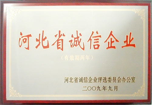 2009年9月,我公司被河北省诚信企业评选委员会评为“河北省诚信企业”,并被收入《河北诚信企业建设成果集》。证书及奖牌于近日发放到公司。